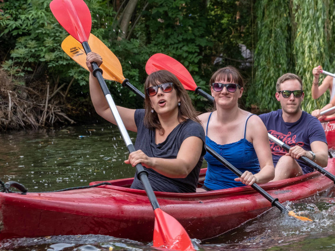 The city port of Leipzig is only a few minutes' walk from the city center and is also very easy to reach by public transport. From here, the waters of the trade fair city are easy to explore. In our 3-seater Canadians, you are safe on the road and have space for lots